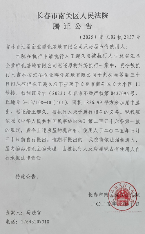 2025年7月23日,一个自称是“南关法院马世钧”的法官给大通公司清算组代总打电话,要求大通公司在月底前将汇圣大厦4楼的所有办公室清空,否则后果自负。代总向对方解释称,他在看到执行公告后,已经在第一时间以公司名义向法院提出了执行异议。
